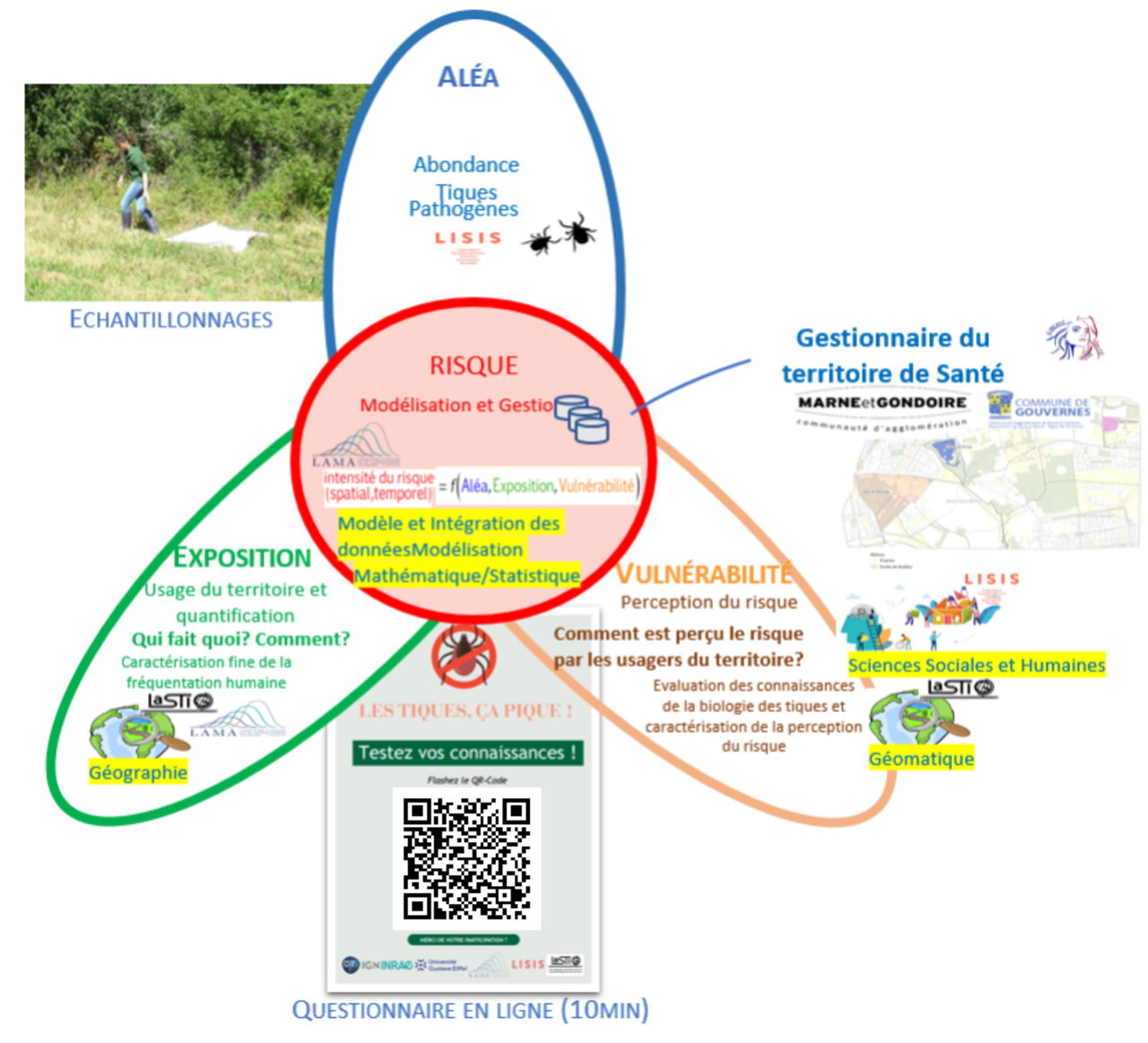 Ce projet d’amorçage exploratoire est co-conçu à l’échelle d’un territoire circonscrit par une expérimentation grandeur nature. Il vise à livrer une approche raisonnée de définition de ces risques selon les caractéristiques de l’abondance de tiques dans ces espaces (aléa), de l’usage de ces espaces en termes de modalités et de fréquentation (exposition) et de la vulnérabilité des usagers selon leur sensibilité vis-à-vis du risque tique et leur niveau d’information (vulnérabilité).